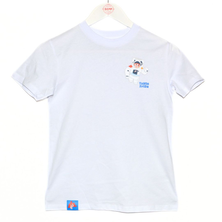 Auf der Vorderseite ziert Tante Frida als Astronautin das Shirt auf Höhe der Brusttasche – liebevoll gestaltet und sofort ein Hingucker. Auf dem Rücken sorgt der witzige Schriftzug „Ein kleiner Schritt für Frida – ein großer Spaß für uns alle!“ für Freude und gute Laune.