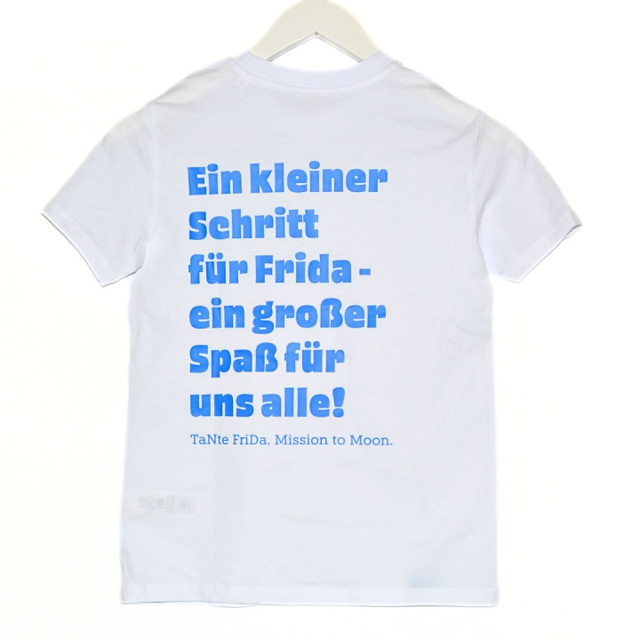 Auf der Vorderseite ziert Tante Frida als Astronautin das Shirt auf Höhe der Brusttasche – liebevoll gestaltet und sofort ein Hingucker. Auf dem Rücken sorgt der witzige Schriftzug „Ein kleiner Schritt für Frida – ein großer Spaß für uns alle!“ für Freude und gute Laune.