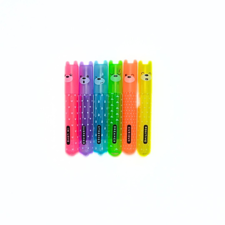 Jeder Stift zeigt einen anderen Gesichtsausdruck mit süßen Teddyohren - mal fröhlich, mal überrascht, mal verschmitzt und auch mal mürrisch.