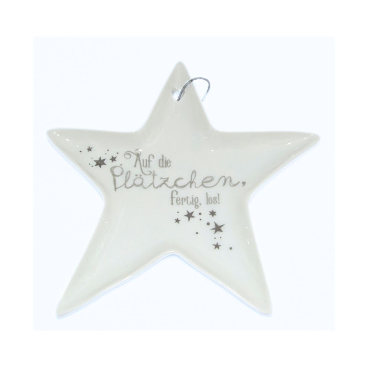 Dieser liebevoll gestaltete Sternenteller aus hochwertiger Keramik bringt festliche Freude auf deine Weihnachtstafel. Mit seiner filigranen Silber-Aufschrift „Auf die Plätzchen, fertig, los“ und einer kleinen Herz-Ausstanzung verleiht er jedem Anlass eine persönliche und charmante Note. Der zarte Sternenteller eignet sich perfekt als dekoratives Element für die Weihnachtsfeier – sei es als Platzkärtchen, für persönliche Wünsche oder natürlich für die leckeren Kekse, die nicht fehlen dürfen.